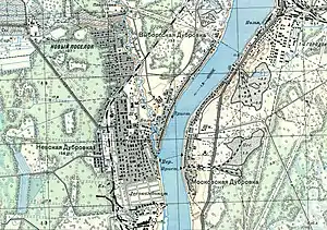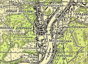 ВЫБОРГСКАЯ ДУБРОВКА — бывшая государственная деревня Дубровской волости при реке Неве, дворов — 51, жителей — 250; Волостное правление (уездный город в 12 верстах), часовня, две лавки и трактир. (1885 год)[15].
