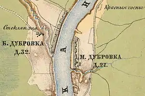 В 1885 году, согласно карте окрестностей Петербурга, Дубровка делилась на Большую и Малую. Большая, на выборгской стороне имела 32 двора, Малая на московской — 27 дворов[14]. Сборник же Центрального статистического комитета за этот год, описывал деревню так: