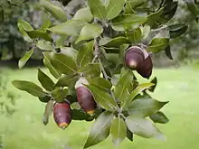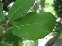 Черешки густо опушённые, 0,5—1,5 см длиной. Листья различные по форме, эллиптические, овальные, узкоовальные или широколанцетные, плотные, кожистые, сверху блестяще-зелёные, совсем или почти голые, снизу сероватые и покрыты густым пушком, иногда на вполне развитых листьях частично или полностью сходящим, в основании округлённые, цельнокрайные или с немногими острыми зубцами, что делает их колючими, 2,5—7,5 см длиной, 1—3(4) см шириной, на нижних ветвях молодых деревьев они могут вырастать до 10 см длиной. Старые листья опадают через год—два после появления новых.