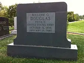 Уильям О. Дуглас умер 19 января 1980 года[5] и был похоронен на Арлингтонском национальном кладбище. На его надгробии он описан как судья Верховного суда и как рядовой Армии США, однако Мёрфи высказал сомнение, что 10-недельная служба Дугласа в армейском корпусе подготовки студентов Уитменского колледжа даёт ему ветеранский статус. Сам Дуглас заявлял, что три месяца воевал в Европе в качестве армейского рядового, но это не соответствует действительности[6].