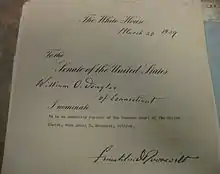 В 1936 году президент Франклин Делано Рузвельт назначил его членом Комиссии по ценным бумагам и биржам[8], а в 1937 году Дуглас возглавил Комиссию. Вскоре он попал на обложку журнала Time[9]. После ухода в отставку члена Верховного суда США Луи Брэндайса, предложившего на своё место Дугласа, Рузвельт выдвинул его на освободившуюся должность в марте 1939 года, и вскоре кандидатура Уильяма О. Дугласа была утверждена Сенатом[4][6][7].