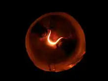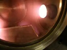 Дуговой разряд с накалённым катодом — несамостоятельный дуговой разряд, в котором основным источником электронов является термоэлектронная эмиссия, для чего катод искусственно разогревается от вспомогательного устройства. Электроны, испускаемые накалённым катодом, способствуют возникновению и горению разряда.[1] Почти все напряжение между его электродами приходится на область вблизи анода, а остальное пространство камеры заполняется однородной светящейся плазмой, имеющей почти потенциал анода. Дуговой разряд данного типа позволяет получать однородную газоразрядную плазму с высокой плотностью в объемах до нескольких кубических метров. Заметим, что данный разряд является источником неравновесной плазмы, то есть температура электронов составляет десятки тысяч градусов в то время как температура ионов и нейтральных атомов остается комнатной.