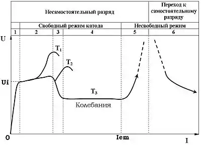При дальнейшем увеличении тока в пятой области происходит увеличение напряжения, и в шестой области разряд переходит в с самостоятельный.