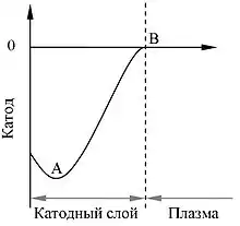 В слое, покрывающем электрод, возникает сильное электрическое поле, вызванное действием нескомпенсированных объемных зарядов, которые экранируют возмущение, вносимое в плазму электродом. Это возмущение не простирается дальше толщины слоя катодного слоя Распределение потенциала φ и поля E в слое рассчитывается по уравнению Пуассона: