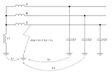 Этого не происходит, когда нейтраль сети заземлена через дугогасящий реактор, индуктивность которого во время ОЗЗ такова, что емкостная проводимость распределённой ёмкости сети и индуктивная проводимость реактора на промышленной частоте равны. Происходит компенсация ёмкостного тока. Ёмкостный ток суммируется в месте замыкания с равным ему и противоположным по фазе индуктивным, в результате остается только активная часть, обычно очень малая, это утечки через изоляцию кабельных линий и активные потери в ДГР (обычно не более 5 А), которой недостаточно для возникновения электрической дуги и шагового напряжения. Токоведущие цепи остаются неповреждёнными, потребители продолжают снабжаться электроэнергией. По действующим нормам допускается работа сети с изолированной нейтралью при ОЗЗ в течение 2 часов, предоставляемых персоналу для поиска и устранения повреждений изоляции.[2]