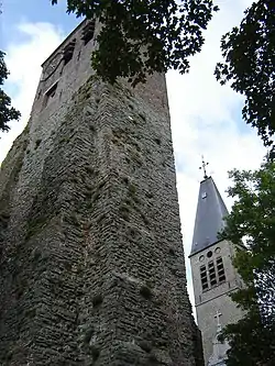 Главный памятник деревни — церковь Святого Петра с двумя башнями. Отдельно от церкви стоит романская башня. Башня — единственный остаток церкви, построенной в XII веке. Фактическая церковь датируется 1871 годом, часть которой датируется XVII веком. Романская башня — это не настоящая церковная башня старой церкви Дудзеле, а всего лишь одна из угловых башен. Должно быть, это была довольно большая церковь. Она была построена между 1150 и 1200 годами и снесена в 1634 году. В деревне также есть несколько домов XVII века.