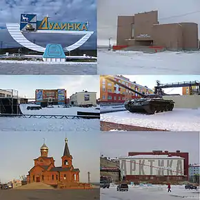 ![]() По часовой стрелке (начиная сверху справа): краеведческий музей; Танк Т-62, установленный в честь 70-летия победы; кинотеатр «Арктика»; Свято-Введенская православная церковь; бассейн «Нептун» | |||||