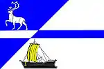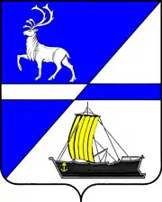 «В щите, скошенном слева лазурью (синим, голубым) и серебром, узкий пояс переменных цветов, сопровождаемый в лазури идущим серебряным северным оленем, и в серебре чёрным кочем с золотыми парусами, канатами и якорем».