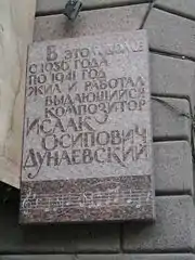 - Москва, Кутузовский проспект д. 27: «В этом доме в 1945—1955 годах жил и работал выдающийся советский композитор Исаак Осипович Дунаевский». скульптор — П. В. Данилов (1956)[16]
