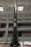 Дунфэн 2 первая китайская баллистическая ракета средней дальности, с предельной дальностью 1250 км и ядерной боевой частью мощностью 15-20 кт. Она получила индекс МО США CSS-1 (англ. China Surface-to-Surface (missile)), то есть китайская ракета класса «поверхность — поверхность»[3]. Некоторые западные наблюдатели считают, что Дунфэн-2 является копией советской Р-5М (SS-3 Shyster), так как они имеют не только схожие дальность и забрасываемый вес, но и одинаковые диаметр, длину (без головной части), форму и расположение хвостового оперения[4][5]. Также, не исключено, что технологии использованные в ракете Дунфэн-2 могли попасть в КНДР, Иран и Саудовскую Аравию[5].