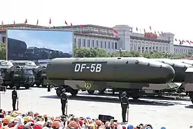 Двухступенчатая, самая дальнобойная китайская межконтинентальная ракета, дальность полета от 12 000 до 15 000 километров. Жидкотопливная DF-5 поступила на вооружение в 1971 году, для заправки требуется от 30 до 60 минут. В планах замена DF-5 на твердотопливные DF-41. В 1986 году вариант DF-5A с увеличенной дальностью до более 15 000 км и более точной системой наведения. Модернизация DF-5A увеличила забрасываемый вес системы с 3000 кг до 3200 кг. Мощность БЧ 4-5 Мт. В 2015 году появился вариант DF-5B, увеличив забрасываемый вес до 5000 кг, оснащенный средствами прорыва ПРО, с от 3 до 8 РГЧ. В 2017 году Китай объявил о испытаниях варианта DF-5C, оснащенных 10 РГЧ. По состоянию на 2017 год в эксплуатации находилось около 20 пусковых установок DF-5.[15]