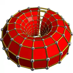 m-угольные призмы соединены друг с другом m-угольными гранями и образуют замкнутый цикл. Подобным обрразом n-угольные призмы соединены друг с другом n-угольными гранями и образуют другой замкнутый цикл, перпендикулярный первому. Эти два цикла соединены друг с другом через их квадратные грани и взаимно перпендикулярны.