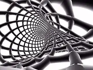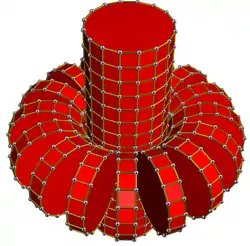 Развёртка![]() Показаны два множества 16-угольных призм. Верхняя и нижняя грани вертикального цилиндра соединены в четырёхмерном пространстве. |