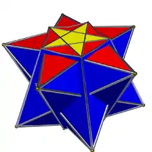 , полученное из 10 пятиугольных антипризм, 10 пентаграммных скрещенных антипризм и 50 тетраэдов. Этот многогранник известен под именем большая дуоантипризма[2][3].