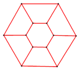 | Шестиугольная призма, спроецированная перспективно на плоскость и центрированная относительно шестиугольной грани, выглядит как два шестиугольника, соединённые (деформированными) квадратами. Подобным же образом проекция 6,6-дуопризмы в трёхмерное пространство близка тору, шестиугольному как в плоскости, так и в сечении. | |
