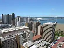По часовой стрелке слева вверху: Durban CBD, Ushaka Marine World, Казино «Солнечный берег» и развлекательный центр, Мозес Мабида (стадион), en:Inkosi Albert Luthuli International Convention Centre и Durban City Hall. | ||||||||