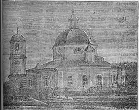 Церковь имела вид продолговатого четырёхугольника. Длина церкви — 13 саженей (27,7368 м), ширина — 11 1/2 сажени (24,5364 м), высота с крестом — 12 саженей (25,6032 м). Алтарное полукружие было пристроено с юго-восточной стороны, с востока и запада примыкали приделы, а с севера — колокольня с небольшими трибунами. Над стенами выведен восьмиугольный купол, как и над придельными алтарями. На куполах установлены железные кресты.