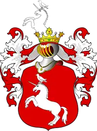 В красном поле единорог вправо, с сизым голубем на голове. В навершии шлема выходящий единорог.