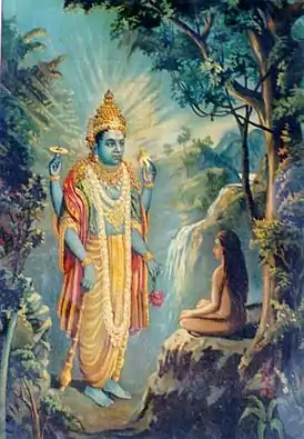 В лесу Дхруве явился мудрец Нарада, посланный к нему Вишну. Нарада попытался отговорить Дхруву, но мальчик настаивал на своём и принял Нараду как своего гуру. Нарада дал Дхруве мантру для медитации: «Ом намо бхагавате васудевая». В течение шести месяцев Дхрува медитировал на эту мантру, не принимая пищи и воды. В конце концов Вишну, приняв образ четырёхрукой формы Бога, предстал перед ним. При виде Вишну, все материальные желания исчезли из сердца Дхрувы.