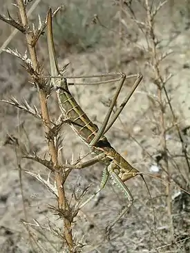 Длина тела самки без яйцеклада 70—80 мм, длина яйцеклада 30—40 мм. Крылья имеют вид очень коротких рудиментов или вообще отсутствуют. Тело сильно вытянутое, голова с резко скошенным книзу и к заду лбом. Передние и средние бёдра несут на нижней поверхности многочисленные сильные шипы. Задние ноги удлинённые, но не прыгательные (хотя дыбка может прыгать с высоты). Тело зелёное или зеленовато-жёлтое, по бокам с жёлтой продольной каймой.