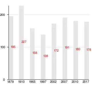 Число жителей по семейным спискам 1879 г.: 80 м. п., 115 ж. п.; по приходским сведениям 1879 г.: 80 м. п., 113 ж. п.[5]