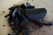 Древесный уголь для пороха получают путём обжига (пиролиза) несмолистых пород дерева (ольха и особенно крушина) с получением продукта, на 80—90 % состоящего из углерода; применение смолистой древесины отрицательно сказывается на свойствах пороха, да и хвойные породы не склонны к образованию угля. Однако хвойные дрова применяют для инициации процесса горения с последующей засыпкой древесины иных пород при историческом способе производства древесного угля. До XIX века выжигание древесного угля производилось в угольных ямах, не позволявших получать однородный по своим свойствам продукт (ввиду наличия одновременно и недожжённой (не пиролизованной), и пережжённой древесины (то есть золы)). И только внедрение пиролиза в стальных ретортах с водяным замком позволило получать гарантированно качественный уголь, при этом лучшими сортами древесины для получения угля считались бук, граб, дуб для тяжёлых углей и берёза в смеси с осиной для лёгких. В зависимости от наличия древесины той или иной породы в данной местности и развития производства угля формировались национальные требования и особенности производства чёрного пороха, поскольку именно качество древесины и степень обжига угля в значительной степени определяют качество пороха. Чем ниже степень обжига угля, тем меньше скорость его горения, что не всегда отрицательный фактор. Содержание чистого углерода в угле должно быть не менее 75—80 %; известно, что при снижении количества угля в порохе скорость его горения возрастает, но с увеличением процента углерода в угле — уменьшается. В охотничьих сортах чёрного пороха содержание селитры иногда немного увеличивали, например, французский и немецкий охотничьи пороха содержали 78 % селитры, 10 % серы и 12 % угля. В «минных» сортах (для производства взрывных работ), наоборот, содержалось больше серы и угля; например, в России применялась смесь из 66,6 % селитры, 16,7 % серы и 16,7 % угля[10]. Порох, использовавшийся в примитивных ракетах XIX века, давал более высокие показатели импульса при повышенном содержании селитры. И наоборот, при снижении количества селитры в порохе эти показатели снижались[13]. В целом с увеличением количества селитры в порохе возрастает и скорость его горения, но до определённого предела — не выше 80 %[14].