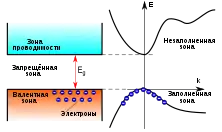 Вблизи дна зоны проводимости полупроводника в дисперсионное соотношение входит эффективная масса электрона , поэтому электрон с энергией вблизи дна зоны проводимости реагирует на внешнюю приложенную силу как обычная частица с положительной эффективной массой — при увеличении волнового числа энергия увеличивается, что выражается на графике в изгибе дна зоны проводимости вверх; через обозначена энергия дна (нижнего края) зоны.