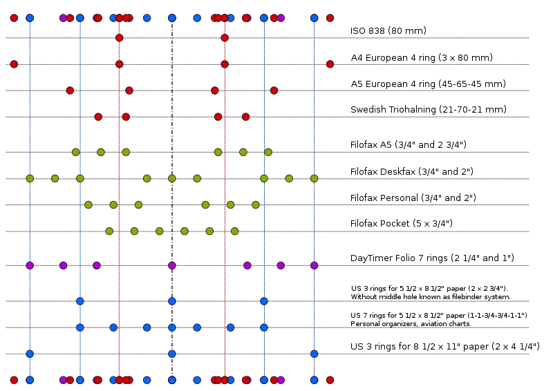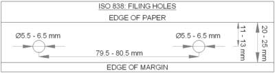 Международный стандарт ISO 838 является самым распространённым стандартом на расположение дырок в дыроколе. Он предусматривает 2 отверстия диаметром 6±0.5 мм с центрами на расстоянии 80±0.5 мм друг от друга и 12±1 мм от ближайшего края бумаги. Отверстия расположены симметрично относительно оси листа. Этот стандарт подходит для формата бумаги не менее 100 мм в длину (ISO A7 и больше), для распечатанного документа поля должны быть 20-25 мм.