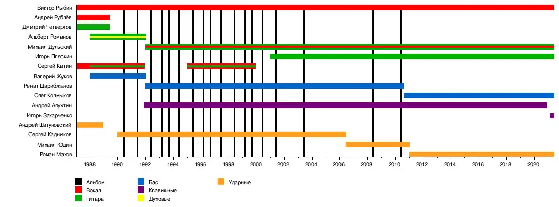 - Андрей «Толстый» Апухтин (1962—2020) — клавишные (1991—2020) — умер 27 ноября 2020 года[20]