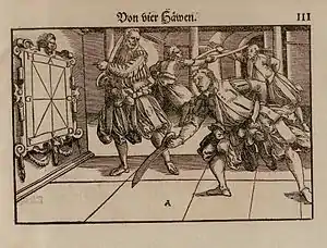 Дюссак (Dussack) — короткое колюще-рубящее холодное оружие. Состоял дюссак только из широкого (5-6 см), прямого или слегка изогнутого сужающегося с острию клинка, функцию рукояти и гарды выполнял длинный загнутый хвостовик. Общая длина оружия 60-95 см, толщина клинка 4-5 мм, клинок не имеет долов и иных конструктивных элементов, изгиб и сужение, как правило, равномерны по всей длине. Происходит дюссак, вероятно, от фальшиона, однако является самостоятельным видом оружия, имея ряд характерных признаков. В 1570 году выходит знаменитая среди фехтовальщиков и исследователей оружия работа Йоахима Мейера, где очень подробно, с большим количеством иллюстраций, наряду с описанием применения двуручного меча, алебарды, цепа и рапиры описывается система фехтования и на дюссаках в том числе. По словам самого автора труда, дюссак в то время был очень распространен в Германии. Кроме того, он считал, что обучение владению дюссаком способствует развитию навыков фехтования одноручным оружием в целом. Вскоре дюссак стал восприниматься чуть ли не как один из основных тренировочных видов оружия во многих фехтовальных школах Германии, просуществовав в таком виде вплоть до конца XVIII в.