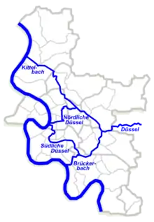 Входя в город (административный район Герресхайм) Дюссель искусственно разделяется на два рукава: Северный Дюссель и Южный Дюссель. Эта искусственная бифуркация реки происходит вблизи усадьбы Хоерхоф (Höherhof). Ниже по течению оба рукава вновь подвергаются принудительному разделению. От Северного Дюсселя отделяется ручей Киттельбах (Kittelbach), а от Южного Дюсселя — ручей Брюккербах (Brückerbach). В результате образуется довольно обширная «дельта» Дюсселя, в которой размещается вся центральная часть города. Собственно Южный и Северный Дюссели в непосредственной близости от Рейна вновь сходятся и впадают в Рейн в Старом городе, будучи заключёнными в трубы, а ручью Киттельбах и Брюккербах расходятся далеко на север и юг Дюссельдорфа и впадают в Рейн естественно. Киттельбах, протекая под взлётно-посадочной полосой дюссельдорфского международного аэродрома впадает в Рейн в административном районе Кайзерсверт, а Брюккербах ограничивает с востока территорию ботанического сада университета и при впадении в Рейн служит границей административных районов Флее и Химмельгайст.