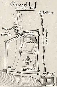 - Периметр города во время образования Дюссельдорфа в 1288 году состоял из участка между Кремерштрассе (Krämerstraße), Альтештадт, Лифергассе (Liefergasse), небольшой переулок в районе церкви и Дюссель, который был защищен рвами и стенами. Здесь свободно протекал Дюссель[16]. Первое расширение города последовало в 1384-1394 годах с пригородом на востоке, районом на сегодняшней Ратингер Шштрассе (Ratinger Straße) и южными районами с Нойштадтом (Neustadt) до Флингер Шштрассе (Flinger Straße) и расширенным Нойштадтом между Флингер Штрассе и Вальштрассе (Wallstraße). На востоке эти районы ограничивались Мюленгассе (Mühlengasse) и Нойштрассе (Neustraße). Достигнутая таким образом городская территория была в значительной степени идентична современному району Альтштадт. Следующие расширения происходили в основном в Карлштадте.