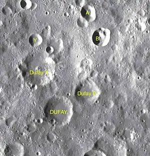- Образование сателлитного кратера Дюфе D относится к нектарскому периоду[1].
