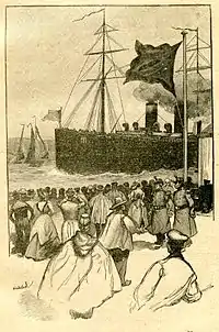 ![]() Иллюстрация Ш. Мореля (~1900). И каждое воскресенье при виде исполинских чёрных пароходов, которые приближались к гавани, изрыгая в небо клубы дыма, отец неизменно повторял: — А вдруг на этом пароходе едет Жюль? | |
