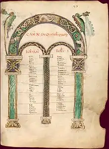 - Таблицы канонов дают представление[3] об островных, англо-ирландских влияниях на стиль Тура: здесь присутствуют мотивы переплетений на арках, косы, орнаментальное оформление колонн контрастирует с их античной формой.