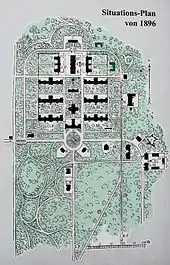 На площади в 95 га с 1889 до 1892 года были построены первые здания, расположенные строго симметрично. Над входом в трёхэтажный главный корпус стоит девиз: «Духовному свету для защиты, общему благу на пользу» (нем. Dem Geisteslicht zum Schutze, gemeinem Wohl zu Nutze). От этого здания вглубь ведёт дорога в направлении восток-запад. Здания комплекса спроектированы в стиле неоренессанса с использованием кирпичной кладки двух цветов — жёлтого и красного[5].