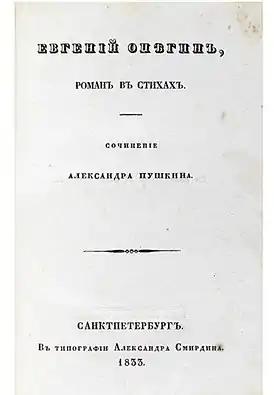 «Евге́ний Оне́гин» (дореф. «Евгеній Онѣгинъ») — роман в стихах русского писателя[1] и поэта Александра Сергеевича Пушкина, начат 9 мая 1823 года и закончен 5 октября 1831 года, одно из самых значительных произведений русской словесности. Повествование ведётся от имени безымянного автора, который представился добрым приятелем Онегина. По словам Белинского, Пушкин назвал «Евгения Онегина» романом в стихах, поскольку в нём изображена «жизнь во всей её прозаической действительности»[2].