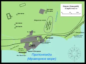 Были построены две башни: на западе др.-греч. Στρογγύλον Καστέλλιον или др.-греч. Κυκλόβιον (Кикловиа, «Круглая крепость» — названная так «согласно форме этого укрепления»[32]) и Theodosianæ на востоке, в которой размещались казармы элитной стражи Theodosiani. Упомянутая Феофаном Исповедником в связи с нашествием аваров крепость Кикловиа (Киклобион) находилась примерно в 2½ милях от Золотых ворот и была настолько тесно связана с Евдомом, что зачастую весь пригород назывался по её названию. Так, в одном из источников евдомская церковь Иоанна Евангелиста называется находящейся в Киклобионе. Также, если Иоанн Антиохийский, говоря о прибывшем флоте Ираклия I, называет Евдом, Пасхальная хроника в качестве географического ориентира называет Круглую крепость. Вероятно, крепость находилась в современном районе Стамбула Зейтинбурну[33]. Крепость Киклобион входила в цепь береговых укреплений. В правление Юстиниана I она, в числе многих других, была отремонтирована и соединена хорошей дорогой с другой крепостью Регием (район Кючук-Чекмедже Стамбула). Гарнизоны этих и других ближайших к Константинополю крепостей были вызваны Юстинианом к столичным войскам для подавления восстания Ника[34].