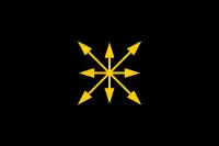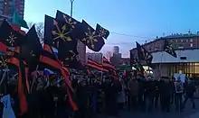 Евразийские знамёна — чёрные знамёна с расходящимися из общего центра золотыми стрелами, символизирующими в понимании сторонников организации максимальное расширение «евразийского пространства»[19]. Восьмиугольник стрел (роза ветров или «крестострел») на чёрном знамени и нарукавных повязках младоевразийцев олицетворяет собой золотую «Звезду Чингисхана в тёмном небе Евразии»[20]. Другие толкования — «звезда абсолютной экспансии»[21] и «Звезда Богородицы»[22]; похожий символ присутствует у писателя Майкла Муркока как «Знак хаоса».