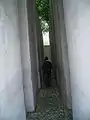 «Сад изгнания» находится вне здания на углубленной квадратной поверхности, а высокие квадратные бетонные стелы перекрывают обзор окружающей среды изнутри.