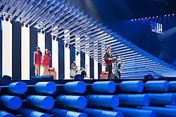 Сцена похожа на огромный «глаз» и состоит из портала и моста, соединяющего артистов, членов их делегаций и зрителей. Сцена имеет 1288 колонн шириной по 44 метра, высотой 14,3 метра и длиной 22 метра. На задней стороне сцены размещена LED-стена шириной 22 метра и высотой 8,5 метров. Сцена позволяет использовать традиционные для современных шоу спецэффекты (прожекторы, лазеры, пар, пирофейерверки и т. д.)[14]