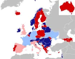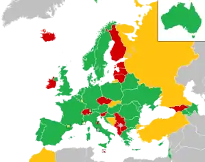 США — поскольку American Broadcasting Company является ассоциированным членом Европейского вещательного союза, то США формально имеют право принять участие в Евровидении. Разговоры о приглашении США на конкурс активизировались после выступления Джастина Тимберлейка в интервал-акте финала Евровидения-2016[57]. Однако для участия необходимо наличие транслирующего Евровидение телеканала в Европейском вещательном союзе, а показывавший конкурс в 2016 году Logo TV там не состоит[58][59].
