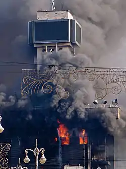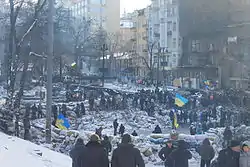 Столкновения между радикалами Евромайдана и противостоявшими им сотрудниками правоохранительных органов, военнослужащими внутренних войск и организованными группами противников Евромайдана[217][218] возобновились 18 февраля, в день заседания Верховной рады, на котором оппозиция планировала обсудить вопрос немедленного возвращения к парламентско-президентской форме правления и восстановления конституции 2004 года, а в поддержку этих требований по призыву лидеров оппозиции было организовано так называемое «мирное наступление» на Верховную раду[219], в котором приняло участие несколько тысяч вооружённых активистов Евромайдана.