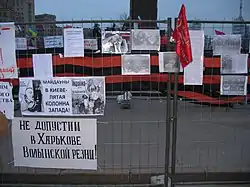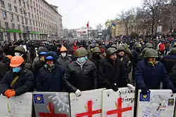 30 ноября 2013 года для защиты Евромайдана началось формирование отрядов «самообороны». Уже к середине декабря в них записалось более 5 тысяч человек[116]. Лидеры трёх оппозиционных парламентских партий (ВО «Батькивщина», УДАР, ВО «Свобода») заявили о формировании «Штаба национального сопротивления»[117]. Разнородные националистические группировки (УНА-УНСО, «Тризуб», «Патриот Украины» и другие) составили праворадикальное экстремистское объединение «Правый сектор», рассматривавшее Евромайдан лишь как удобный повод для начала «национальной революции», которая, по словам лидера «Правого сектора» Дмитрия Яроша, должна была завершиться «полным устранением режима внутренней оккупации и созданием украинского национального государства с системой всеохватывающего национального народовластия»[118].
