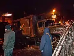 После окончания митинга несколько сотен радикально настроенных активистов, вооружённых дубинками, камнями и бутылками с зажигательной смесью, пошли на штурм охраны правительственного квартала, расположенного на улице Грушевского[121]. Они попытались прорвать оцепление милиции у входа на стадион «Динамо», подожгли транспорт отряда «Беркут» и стали закидывать правоохранителей камнями и бутылками с зажигательной смесью, избивать их палками[207]. Против нападающих были применены шумовые гранаты и слезоточивый газ[208] и водомёт[207].