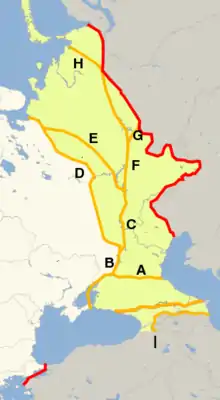 - По границе между проливами Босфор и Дарданеллы, европейская часть включает илы Турции: Эдирне (ок. 6300 км²), Кыркларели (ок. 6550 км²), Текирдаг (ок. 6300 км²), 25 районов ила Стамбул (более 3200 км², включая европейскую часть города Стамбул), 3 района ила Чанаккале (ок.1600 км²). Суммарная площадь составляет около 23 900 км² или около 3 % от общей площади Турции в 783 562 км², см. Восточная Фракия.
