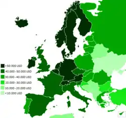 Уровень благосостояния в Европе сильно различается. Самые богатые страны в основном расположены в Западной и Северной Европе, более бедные находятся во многих странах Восточной Европы и на Балканах. По данным Всемирного банка (2011—2018 гг.), самыми богатыми странами Европы с точки зрения ВВП (ППС) на душу населения являются Люксембург, Ирландия, Норвегия, Швейцария и Нидерланды. Беднейшими странами являются Молдова, Украина, Босния и Герцеговина, Албания и Сербия[25].