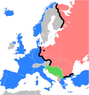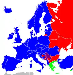 В период после Второй мировой войны до 1989—1991 Европа была центральной ареной холодной войны между западным (капиталистическим) и восточным (социалистическим) блоками. Большинство стран Западной Европы в это время в военно-политическом плане объединились в рамках НАТО. Социальную и правовую интеграцию обеспечивал Совет Европы, экономическую — Европейское экономическое сообщество. На востоке континента военной интеграционной структурой выступала Организация Варшавского договора, экономической — Совет экономической взаимопомощи; в обеих доминирующую роль играл СССР.