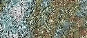 Рельеф некоторых участков поверхности указывает на то, что здесь лёд когда-то был расплавлен, и в воде плавали льдины и айсберги. Видно, что льдины (вмороженные ныне в ледяную поверхность) ранее были одним целым, но затем разошлись и повернулись. Некоторые участки с волнистой поверхностью[62] образовались, вероятно, в результате процессов сжатия ледяного панциря.