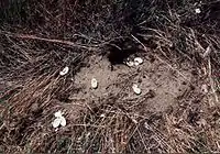 Кладка яиц происходит на берегу, обычно неподалёку от водоёма, но часто в поисках места для гнезда черепахи удаляются на значительное расстояние от воды. В зависимости от района обитания за сезон самка делает до трёх кладок. По исследованиям А. Г. Банникова, первая кладка яиц может наблюдаться уже в середине мая, при этом яйца, возможно, были оплодотворены ещё в предыдущем году. Вторая кладка происходит в конце июня, а третья — в июле. В северных и предгорных частях ареала черепахи могут делать только 1—2 кладки. Яйца откладываются в ямку, которую самка выкапывает задними лапами на предварительно расчищенной головой и передними ногами площадке. Сведения о том, что в начале рытья черепаха высверливает хвостом конусовидное углубление, очевидно, основано на недоразумении. Процесс рытья может занимать один—два часа. Гнездовая ямка имеет вид кувшина с широким горлом и в глубину достигает 10—17 см, диаметр в верхней части — 5—7 см, в нижней — до 13 см. Яйца откладываются порциями по 3—4 штуки с небольшими интервалами (3—5 минут). После этого самка закапывает ямку задними лапами[4][6] и маскирует место кладки, разглаживая поверхность земли пластроном.